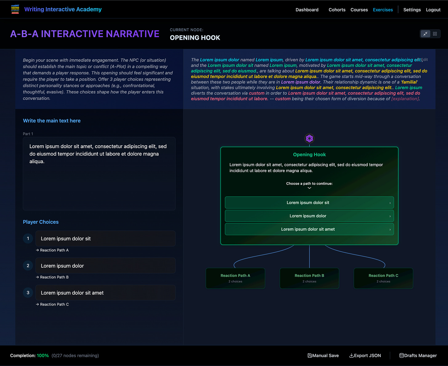 There are many tools out there for writing games. In my workshops we predominantly use Twine, Ink, and for the 101 Branching Dialogue Class, a tool of my own devising for custom narrative structures—>